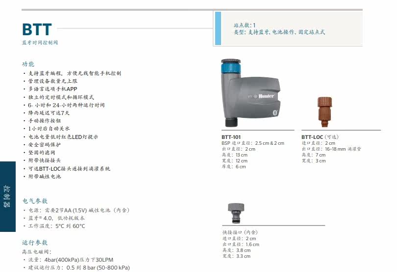 BTT 是一款支持蓝牙®功能、干电池供电的时间控制阀,可通过 iOS 或 Android 智能手机控制,即使再小的区域也能实现充分灌溉。BTT 经久耐用,在室内和室外都是完美的无线灌溉解决方案,特别适用于培植园、温室、阳台、盆栽、花坛、苗圃以及没有地埋灌溉设备的小块草坪。