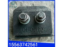 QU120焊接型轨道固定件(俗称压轨器),压轨器是以套为单位的,整套包括:上盖、底座、穿梢、螺母螺栓,弹平垫圈几部分组成的。材质有两种:一种上盖是球墨铸铁、底座是铸钢的,另一种是全套铸钢的