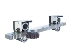 在双沿V型导轨上,安装齿条,工厂出厂前已经装配好,除了省去导轨和齿条在现场分开装配的对齐问题,同时也省去了两条单沿V型导轨安装时的平行对齐问题。齿条有这几种模数可供选择:0.7,1, 1.5, 2。和装配式齿条导轨配套使用的,为齿轮齿条驱动滑座;滑座上装有滚轮轴承,小齿轮,齿轮齿条回差微调机构,减速机法兰。选型时,选好装配式齿条导轨型号和对应的齿轮齿条驱动滑座型号;出厂时,工厂将调试好;在现场装配的时候,把减速电机通过减速机法兰和滑座连接在一起,就可成为齿轮齿条驱动直线运动单元。
