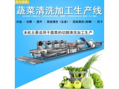 新型净菜加工生产线一共7台设备,主要用于叶菜的清洗、消毒和切割,顺序分为:原料提升机、三层挑选输送机、大型切菜机、二次提升机、全自动涡流清洗机、毛刷清洗机、震动吹干机,整线设计合理,使用人性化,自动化程度高,清洗效果好,不损伤物料,是净菜加工和中央厨房理想设备。