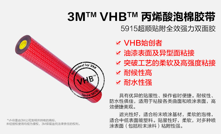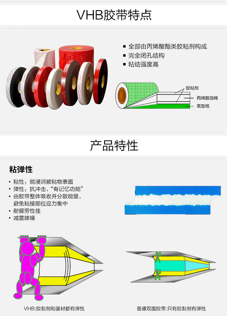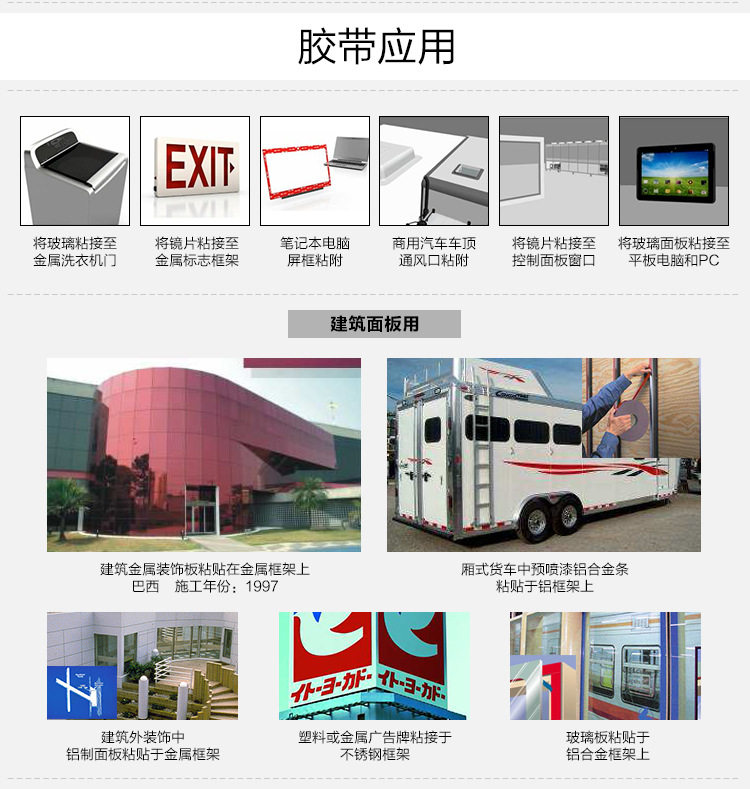 特 性:具有超强的粘性、防水性和耐候性;还具有若软、服帖性好的特性,具有高拉伸力,可剪切的特定。用泡沫胶带固定使产品表面光滑美观,操作简单,粘力持久,无残留。服贴性高,优异的填缝效果,独特的背胶亦适用于不同表面及低温施工使用。可冲型,切卷,模切成型。