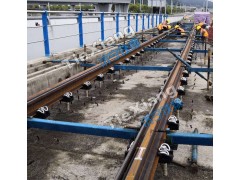 以一根钢轨为基本轨将轨道尺架在两股钢轨上,测量此时两轨面连线中心线到基标中心的距离。根据实测轨面和基标高差对两支承丝杆作相应的升降。此时可以拧动两丝杆,使支撑架连同轨道上升或下降。本工序应对前后两支撑架作适当调整,使其(济宁铁翔)顶面尽量在一平面内。