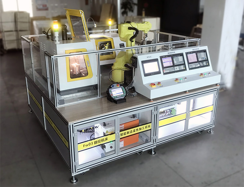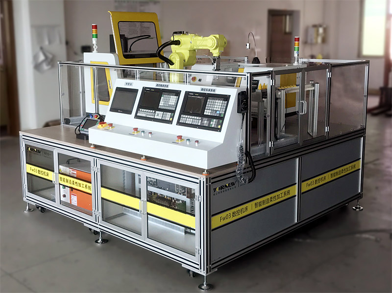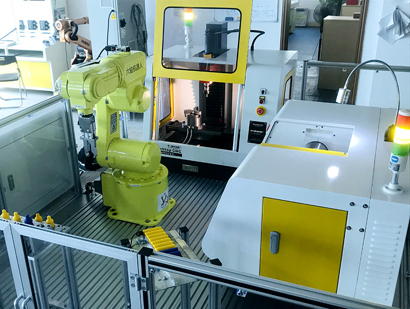 本套设备是以小型的柔性制造系统为载体,主要特点是占地空间小、操作安全、涉及的知识点丰富、综合,系统性强、成本低、师生容易上手等;主要是由一台工业6轴自由度机器人、一台三坐标机械手臂、一台柔性数控车床、一台柔性数控铣床、RFID系统、PLC工作站、智能仓库、中控台、传输带等部份组成,实现自动化上下料、加工等无人工作环节,机器人按指令分别给两台机器送料取料;该系统能够实现工业机器人上下料工作站系统的编程、上下料系统的集成、RFID系统应用、PLC系统编程、数控车床编程加工、数控铣床编程加工、现场总线的通讯实训等环节。让学生轻松掌握工业6轴机器人上下料与数控机床组建柔性加工生产系统,能满足学生对工业机器人学习及操作的需要,学生通过该套系统的学习与训练,对智能生产无人工厂的组建整体性应用有全面的了解与体验。