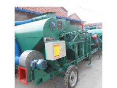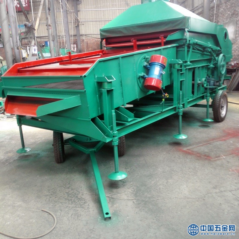 本机是将风选和筛选完美组合一体的组合机械,集风选和筛选的优点于一身,两者结合达到清大杂、小杂、泥灰的目的,并可将大杂、小杂、泥灰分类出料,也可调换筛片适应处理各种大小颗粒的种子、豆类的要求。本实用新型利用双层滚筒筛和振动筛船与风力相结合,除杂效果好,铸钢轴承座,双轴承,耐用钢板加厚,具有扭矩力强、抗磨、使用年限长久和维修几率低特点