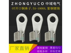 中域电气,OT铜开口鼻子系列,高纯紫铜,表层酸洗(可镀锡),导电性强,抗氧化。产品采用优质紫铜板冲压,其应用领域广泛,如变压器,稳压器,及各种发电机,通讯电缆等,适用于配电装置中导线连接。