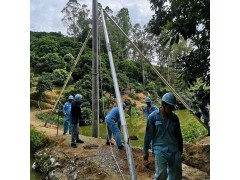 三角形立杆机的立杆方式跟组成部分就是上述的那些,需要注意的就是需要根据实际立杆高度选配设备,长度高的立杆机可以起立低一点的线杆,但是如果高度低的立杆机起立高的线杆。说完了三角形立杆机,说下人字立杆机的操作方式,人字立杆机有两种形式的,一种人字拔杆是固定式的,固定式人字拔杆的施工方式跟三足立杆机的一样,就是两根杆子,其中一根杆子上边有手摇绞磨,杆子的帽子上边有打风绳的,也就是说双杆立起来以后,然后在杆子的左右各打一根拉线,这样人字拔杆就固定好了,立杆施工的过程跟三角立杆机的一样,先把坑洞打好,然后在通过手摇绞磨把滑车放下来,然后把钢丝绳绑缚在需要起立的线杆三分之二处。然后缓缓的转动手摇绞磨,把线杆起立以后完成立杆。