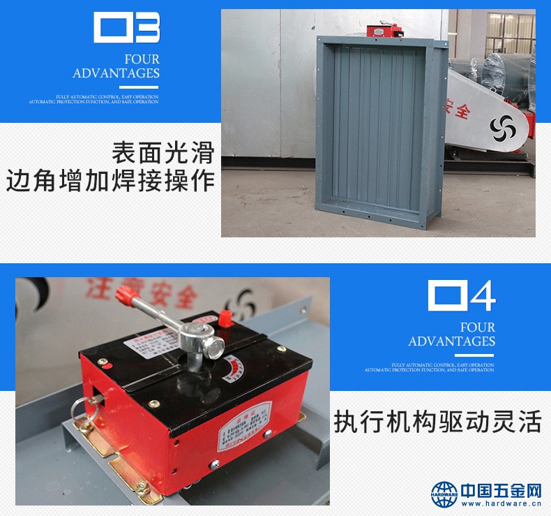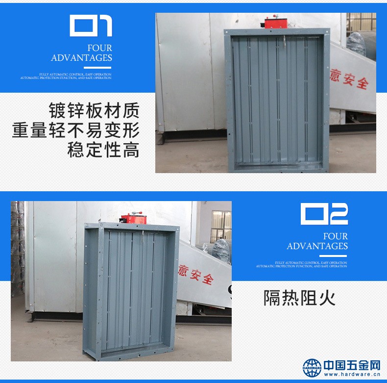 防烟防火调节阀。防火阀的作用是:当烟气温度达到280℃时,人已基本疏散完毕,排烟已无实际意义,而烟气中此时已带火,阀门自动关闭,以避免火势蔓延。有矩形和圆形两种。可应用于有防烟防火要求的空调、通风系统,其构造与防火调节阀基本相同,防火排烟阀参数,复位方式和风量(定义:单位时间内空气的流通量)调整方法与防火调节阀相同。
