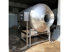 真空滚揉机能将肉块在真空状态下采用圆筒内导板自挤压原理进行滚揉。当筒内转动时肉块在真空状态下膨胀,纤维组织拉开后按导板导向往里挤压,肉块经自我摔打、相互挤压,使肉体蛋白质分解成水溶性蛋白,易被人体吸收。同时能使添加料(淀粉等)高层深入肉块纤维组织内部与肉体蛋白质互为融合,以达到肉质变嫩、口感好、成品出量高的目的。