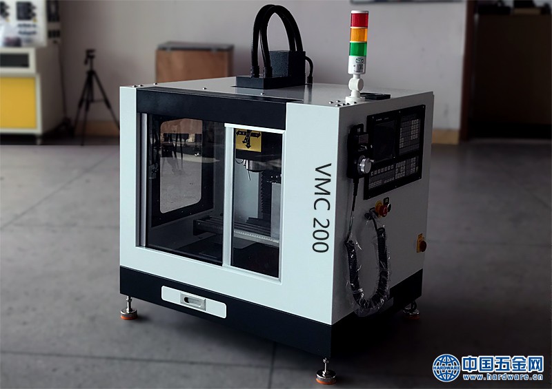 VMC200是一款使用220伏电压的桌面型加工中心,占地小、重量轻;主要用于智能制造工业互联网生产线教学项目及FMS柔性制造工业机器人上下料加工单元,机床联网等;机床设计有自动门及32个路IO端口便于与工业机器人通讯,支持上位机通过网口读取系统状态数据,如转速、位置、坐标及远程传输文件功能等。采用全封闭安全设计结构,配置工业数控面板数控系统;4工位换刀系统,使用气压0.6Mpa,主轴采用高速精密主轴单元。用于铣削雕刻及钻孔加工,主要加工黄铜、铝合金、PVC塑料等材料。