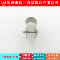 硅碳棒夹具一般指的是不锈钢G型夹,M夹蝴蝶夹,C型夹,不锈钢陶瓷夹,铝编织带,铝箔连接导电带。硅碳棒夹具是固定和连接硅碳棒与硅碳棒或母线之间的一种连接金属装置,硅碳棒连接带按材质可以分为铝箔带和铝编织带。陶瓷夹器按材质可以分为不锈钢陶瓷夹和镀锌陶瓷夹,因为不锈钢材质性能决定,不锈钢的刚性没有镀锌的刚性好。硅碳棒具有耐高温急冷急热易安装,密度高发红均匀电阻一致,环保节能工作时间长,升温快规格齐全,非标定制发货周期短等优势,郑州市铭一高温设备有限公司是生产高温电炉加热元件硅碳棒,硅钼棒,不锈钢陶瓷夹,铝编织连接带22年的生产厂家。
