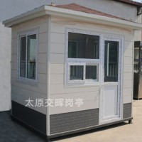 产品特点 1、岗亭材质表面经特殊工艺加工处理,精工制作而成,款型别致,品种繁多,适用于各种通道关卡及停车场。 2、主体骨架采用不锈钢整体焊接而成,强度高,抗风压。 3、顶部材料采用特殊防水铰接工艺,解决漏水之患。 4、所有岗亭留有空调及其它电器电源插座,方便使用。可根据您的特殊要求设计制造出不同款式的岗亭。 产品材质 1、支撑柱 :采用不锈钢成型1/4圆柱焊接而成 2、框架:采用不锈钢成型方通焊接而成 3、圆弧裙边:采用不锈钢板成型焊接而成 4、外面板:不锈钢板 5、内面板 :不锈钢板 6、岗亭内壁:中间为方通架, 7、底座;底层为角钢架,中间为木板 表层为防滑铝板 或防滑铁板 8、内吊顶 :装饰板 9、外顶:中间为方通架,表层为不锈钢板 10、活动门:不锈钢板 11、活动窗:不锈钢板 适用范围 适用于收费、物业、高速公路、大厦、广场,小区、保安值班。