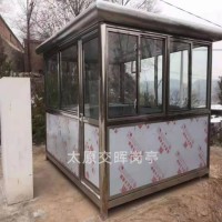 产品特点 1、岗亭材质表面经特殊工艺加工处理,精工制作而成,款型别致,品种繁多,适用于各种通道关卡及停车场。 2、主体骨架采用不锈钢整体焊接而成,强度高,抗风压。 3、顶部材料采用特殊防水铰接工艺,解决漏水之患。 4、所有岗亭留有空调及其它电器电源插座,方便使用。可根据您的特殊要求设计制造出不同款式的岗亭。 产品材质 1、支撑柱 :采用不锈钢成型1/4圆柱焊接而成 2、框架:采用不锈钢成型方通焊接而成 3、圆弧裙边:采用不锈钢板成型焊接而成 4、外面板:不锈钢板 5、内面板 :不锈钢板 6、岗亭内壁:中间为方通架, 7、底座;底层为角钢架,中间为木板 表层为防滑铝板 或防滑铁板 8、内吊顶 :装饰板 9、外顶:中间为方通架,表层为不锈钢板 10、活动门:不锈钢板 11、活动窗:不锈钢板 适用范围 适用于收费、物业、高速公路、大厦、广场,小区、保安值班。