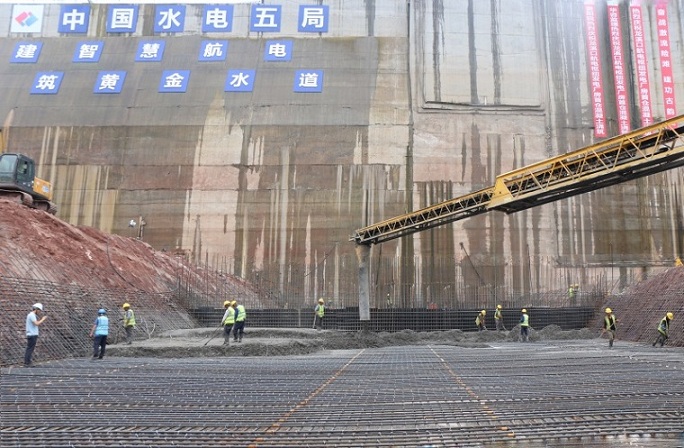 (2)台阶法:对于仓面面积大、钢筋密集、结构复杂的仓位,经监理批准后可使用台阶法浇筑,以满足温控及覆盖前混凝土不初凝等条件要求。台阶的一次铺料宽度控制在8~10m以上,接头部位台阶宽度不小于3~4m。