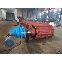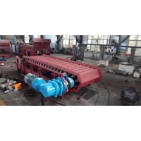 为板式给料机输送物料提供工作动力。工作时电机功率传输到减速机上经过变速后传到与之相配套的传动轴上,传动轴带动与之相配套的链轮,链轮带动链条运动,再有链条带动槽板和槽板上的物料运动,完成输送目的。