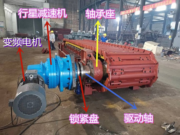 主轴驱动装置由1根头部驱动轴,2个轴承座,2个驱动链轮,1个锁紧盘,变频电机和行星减速机等组成。(见下图)