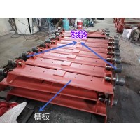 滚轮由支承座和槽板固定,滚轮在轨道上滚动,带动槽板和槽板上的物料运动。